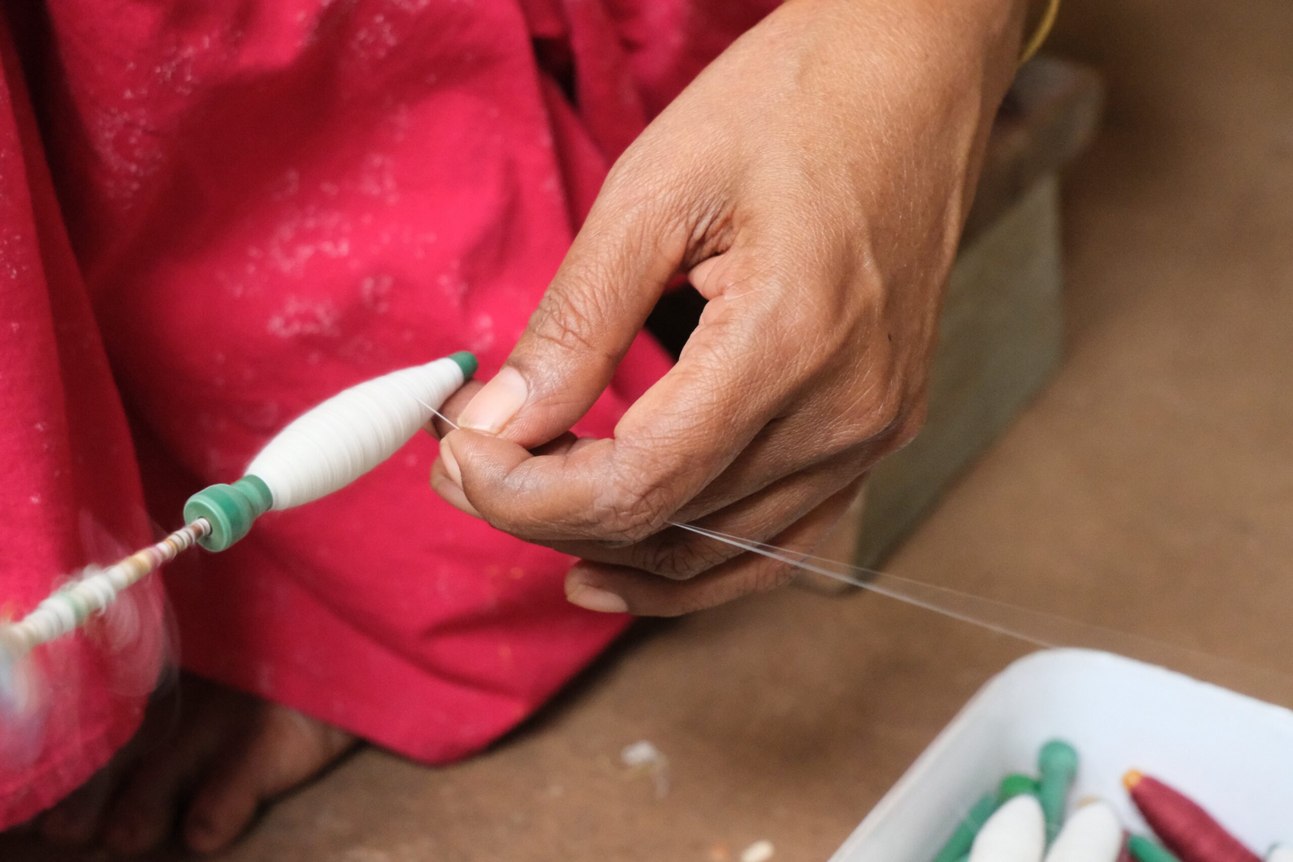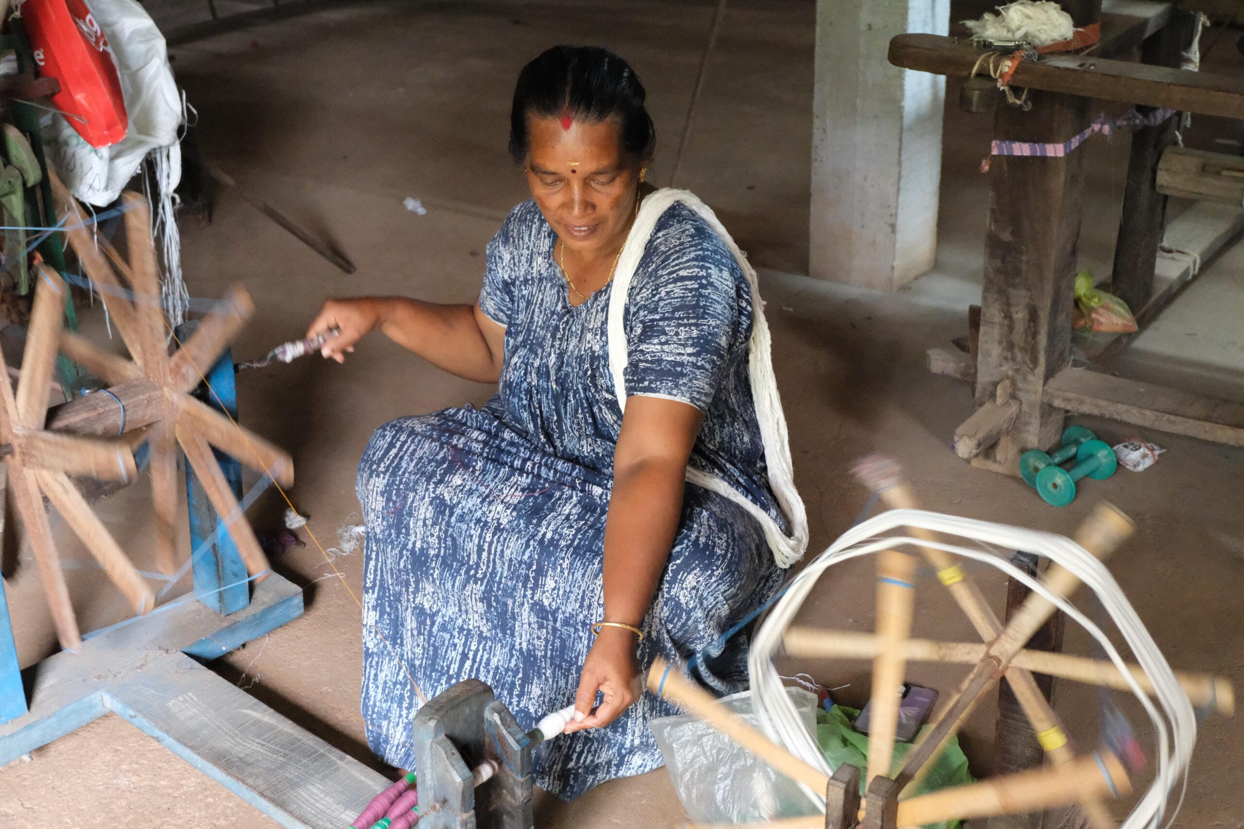 Our primary seller – Chengamanad Handlooms is very particular about the authenticity of traditional handlooming. The process starts with collecting raw cotton thread from the mills of Nagercoil and Kannur. The threads are then twisted to form a warp creating the foundation of the cloth. Using a charkha, the yarn is carefully wound onto bobbins. These bobbins play a crucial role in warping: the threads are stretched and prepared for the loom.