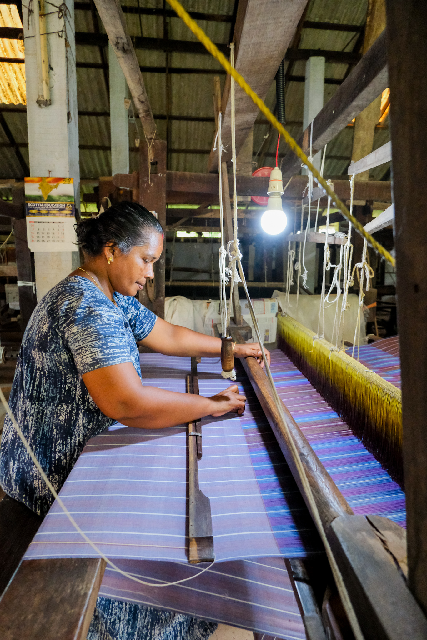 The hearty laughter and chatter of the 13 craftswomen carry over the loud grinding noise of the weaving machines.